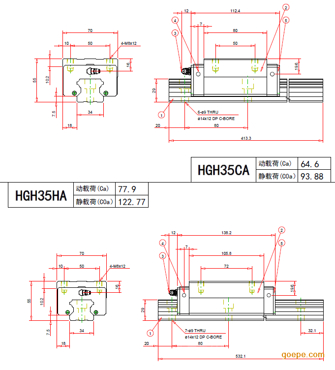 台湾上银导轨滑块HGH35CA,高组装滑轨,互换性滑块,结构是钢球或滚柱的滚动体在滑块与滑轨之间做无限循环运动的直线运动轴承。